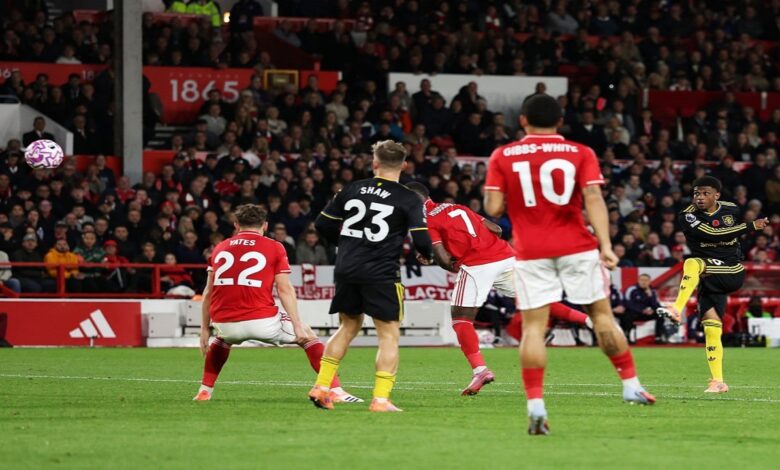 یونایتد با گل کاسمیرو در دقیقه ۳۴، برنده به رختکن رفت، اما در دقایق ابتدایی نیمه دوم کاملاً غافلگیر شد. گیبس وایت و نیکولو ساوونا ظرف تنها دو دقیقه، ناتینگهام را پیش انداختند و این نتیجه تا دقایق پایانی پابرجا بود. در دقیقه ۸۱، شوت تماشایی آماد دیالو بازی را به تساوی کشاند و یونایتد را نسبت به کسب یک پیروزی دیگر، امیدوارتر کرد. در ثانیههای پایانی بازی، نزدیک بود که آماد شب درخشانش را تکمیل کند و گل سوم منچستریونایتد را هم به ثمر برساند، اما بازیکن فارست از روی خط، توپ را بیرون کشید تا بازی با همان نتیجه ۲-۲ خاتمه یابد. ضمن اینکه در دقیقه ۶۱ نیز شوت برونو فرناندز به تیرک دروازه فارست برخورد کرده بود.
